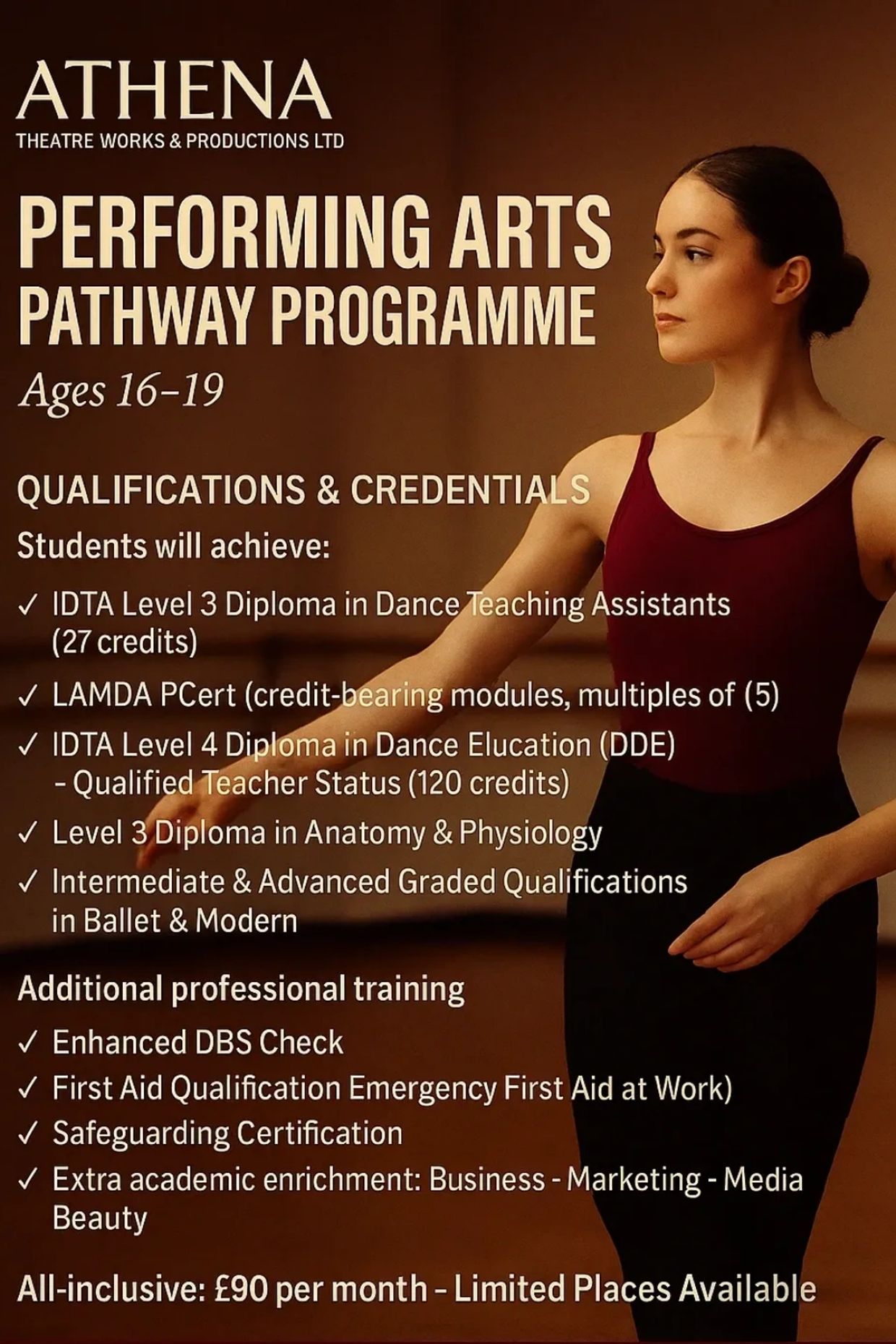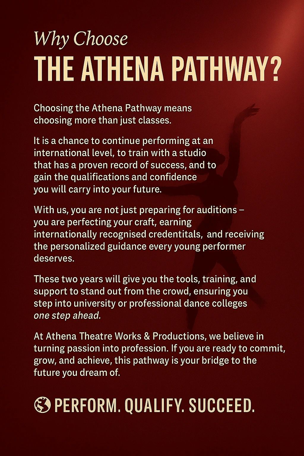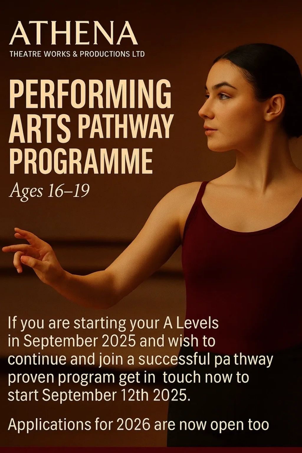 The Pathway has been carefully created by Athena Burns, Principal of ATWP, who has drawn on her own personal experiences and the challenges she faced during her training. It provides everything she needed but did not have access to, ensuring that today’s dancers are supported with the opportunities, guidance, and professional preparation she once lacked.