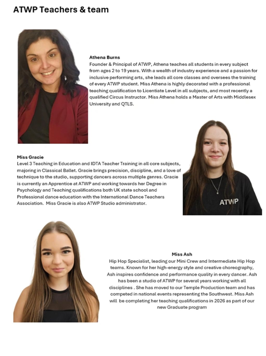 This international dancer has five daughters, and two Siberian Huskies and that only encourages her to work harder. Athena is passionate about dance and enjoys both performing and teaching. Athena's Schools are renowned for the happy and enthusiastic atmosphere they create; Athena is a very driven and hard-working individual but puts a spin on the hard work that is needed within this industry with her upbeat and kind nature towards her students and team. Athena Theatre Works & Productions will have Athena's full attention now and her ambition to create a college program for those wanting to receive professional qualifications and teacher training within all aspects of the arts in the beautiful South Coast of England.
